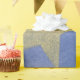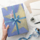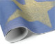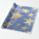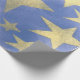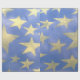 This wrapping paper features stenciled glowing large gold stars on a blue background. Can be used for a patriotic theme or for most other occasions.