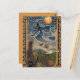 This unique, vintage Halloween postcard features an autumn scene with a black cat, white owl and bat playing in a harvested wheat field with pumpkins. A beautiful starry night with a witch flying through the sky on a broomstick formed from the stars.