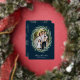 Send Hanukkah greetings to friends and family in chic style with our elegant photo cards. Your favourite vertical or portrait orientated image is framed by an oval laurel wreath of green watercolor eucalyptus leaves on a dark navy blue background accented with gold foil stars. Personalise with your custom holiday greeting and names beneath.