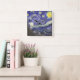Starry Night by Vincent van Gogh is a vintage fine art post impressionism landscape cityscape painting featuring a view of Saint Remy, France from van Gogh's asylum. The night sky is swirling with clouds with a bright crescent moon and shining stars over the quaint village. Starry Night is probably van Gogh's most famous painting and was painted during the day from memory.