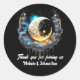 A wonderful and vibrant crescent ivory moon with ornate swirls on it is surrounded by pale grey fluffy clouds throough which night stars appear to twinkle and shine against a midnight black background that may be changed to any colour of your choice. Ideal on wedding favour gifts at a moon and stars wedding; for your special starry night themed anniversary or for any wiccan business; lodge or resort.