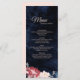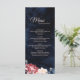This Starry Night Floral wedding menu inspires either a midnight summer theme or a dark winter of snow theme, making it a seasonally versatile design. The navy blue, almost black, watercolor with a celestial star or snowflake filled sky, combined with the pop of minimal pink flowers and calligraphy is sure to speak to the magic of your marriage celebration, regardless of the time of year.