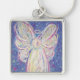 The art shows a soft pastel angel against a soft blue starry night background. The image was initially painted with acrylic and then finished in pastel to create soft luminous colour. Customised this white light guardian angel art keychain pendant with your own text and images to make personalised special angel keychain charm gifts!