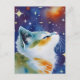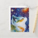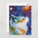 Artistic postcard features an AI generated digital watercolor painting of a beautiful calico cat with starry cosmic night sky background