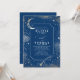 Romantic and mystical engagement party invitation featuring crescent moon, shooting star and galaxies.
