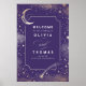 Celestial night sky, crescent moon and stars wedding welcome sign