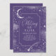 Silver and purple romantic mystical birthday party invitation featuring a crescent moon, shooting star and galaxies.
