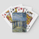 Thatched Cottages at Cordeville. Vincent Willem van Gogh. Night landscape in dark blue and yellow tones. There is a bridge across the river. In the foreground, a man and a woman are walking along the embankment. The stars are shining in the sky. Reproduction of famous works of art images in the public domain.