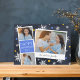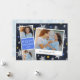 Cute Hanukkah photo card features a photo booth strip with two photos and a blue text panel, plus an instant camera-inspired snapshot with a handwritten caption. Personalise with the year and your family name or custom message, on a navy blue background dotted with hand drawn snowflakes and blue and gold stars.