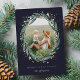 Send holiday greetings to friends and family in chic style with our elegant photo cards. your favourite vertical or portrait orientated image is framed by an oval laurel wreath of green watercolor eucalyptus leaves and gold foil stars on a dark background. Customise with your custom holiday greeting and names beneath in off-white lettering.