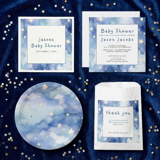 Invite loved ones to a magical baby shower with this elegant invitation, featuring a dreamy watercolor illustration of a blue night sky scattered with soft clouds and gold and ivory stars. Whimsical “Baby Shower” script headlines the centre, framed by modern serif details for the date, time, venue, and RSVP. The celestial theme’s gentle blue gradients and delicate stars create a soothing, gender-neutral look—ideal for boys, girls, or any evening celebration. The spacious, minimalist layout ensures your important details stand out, while the enchanting artwork sets a joyful and unforgettable tone for your event.