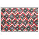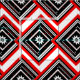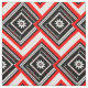 Here is a modern contemporary red, white and black fabric design in an abstract geometric pattern of rectangles, squares, lines and stars surrounded by a chevron motif.