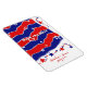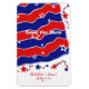 A red, white and blue patriotic design with wavy lines and stars. Customise text.