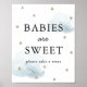 This cute "babies are sweet, please take a treat" boy baby shower sign / poster features a white background with faux gold glitter stars and fluffy blue clouds. Change the background colour and personalise it for your needs. You can find matching products at my store.