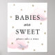 This cute "babies are sweet, please take a treat" girl baby shower sign / poster features a white background with faux gold glitter stars and fluffy pink clouds. Change the background colour and personalise it for your needs. You can find matching products at my store.
