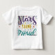 The t-shirt design features the text "Stars Shine Proud" in a playful, colourful font, surrounded by whimsical doodles and stars. The design is vibrant and eye-catching, and the playful font adds a touch of whimsy.