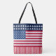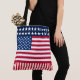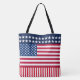 This tote bag is perfect for celebrating the Fourth of July and throughout the summer, shown with a fun patriotic stars and stripes flag print design.