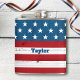 Enjoy relaxing with your favourite beverage whenever you use this striking, graphic, patriotic, custom vinyl wrapped flask. Navy blue bold typography overlays rustic, vintage, bold, graphic, red and white stripes and white stars on blue, American flag country wood panelled background. Personalise with your name. Great for Fourth of July bbqs, as well as any time of the year!
