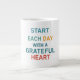 Begin every morning with a reminder to embrace gratitude! This oversized mug features the uplifting message "Start Each Day with a Grateful Heart," perfect for holding an extra-large coffee or tea. With a warm and inviting design, it’s more than just a mug – it's a gentle reminder to focus on the positives. Ideal for cosy mornings, work breaks, or as a thoughtful gift to someone special.
