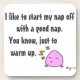 YAWN! In the art of napping, it is good to start one's nap off with a good nap to warm up! So nap like a pro with this super funny design! "I like to start my nap off with a good nap. You know, just to warm up." - a person joke of mine. ;-) Original artwork by Sunny. Copyright 2013