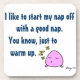 YAWN! In the art of napping, it is good to start one's nap off with a good nap to warm up! So nap like a pro with this super funny design! "I like to start my nap off with a good nap. You know, just to warm up." - a person joke of mine. ;-) Original artwork by Sunny. Copyright 2013