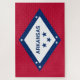 This design features the flag of Arkansas, which is a state in the south central region of the United States. The state's diverse geography ranges from the mountainous regions of the Ozark and the Ouachita Mountains, which make up the U.S. Interior Highlands, to the densely forested land in the south known as the Arkansas Timberlands, to the eastern lowlands along the Mississippi River and the Arkansas Delta. The capital and largest city of Arkansas is Little Rock. The nickname of Arkansas is the "Natural State", but it used to be known as the "Bear State". The flag of Arkansas consists of a large blue-bordered white lozenge or diamond on a red background; the name of the state is inscribed in the centre.