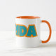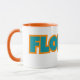 This custom coffee mug features a design that displays the word "Florida" in a Luckiest Guy print font with aqua coloured letters orange coloured outline in this custom state pride jersey style theme. The rim & handle are glazed in matching colours available in 11-ounce or 15-ounce sizes microwave and dishwasher safe ceramic construction.