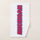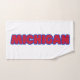 This custom hand towel features a design that displays the word "Michigan" in a Hit and Run print font and red coloured letters plus blue outline in this custom state pride jersey style theme. This towel is made with a polyester blend front while the back is 100% cotton all towels will use sublimation/vibrant printing which is designed to last.