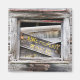 The remains of an old sign in the window of a dilapidated barn.