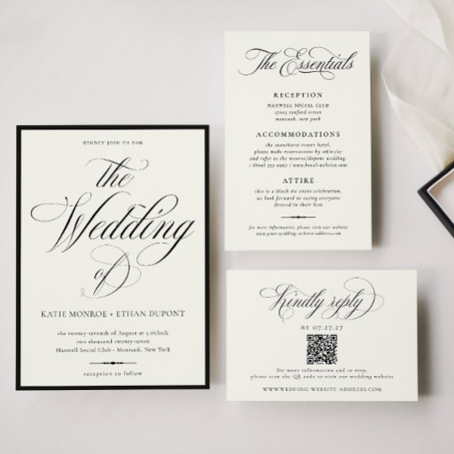 STATELY, calligraphy and vintage floral lined black and ecru wedding invitation envelope.