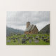 Jigsaw puzzle of a wooden stave church with tombstones and graves on a graveyard at the edge of a fjord between the mountains in Gaupne, Sogn og Fjordane in Norway.