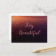 Beautiful motivational postcard with the word "Stay Beautiful" in simple script font and sunset ocean water photograph background.