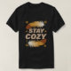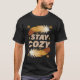 Embrace winter vibes with this cosy Stay Cosy t-shirt! Soft feathers, golden snowflakes & warm tones on black. Perfect hygge gift, loungewear, or cold-weather essential for ultimate comfort.