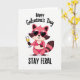 This greeting card features a white background with a cartoon raccoon right in the center, dressed in a hot pink bikini and smiling wide. The raccoon’s fur is shaded in soft pink tones, and it wears black heart-shaped sunglasses that hide its eyes and add a fun, confident look. In one paw, it holds a champagne flute filled with golden bubbly, with a tiny star-like sparkle on the glass. Across the top, the text “Happy Galentine’s Day” curves overhead in a cursive-style look, standing out clearly against the white space. Near the bottom, “STAY FERAL” appears in all caps with thick, simple lettering that feels direct and cheeky. It’s a sweet choice for a friend because it mixes affection with a little humor, like saying, “I love you, and I love your wild side too.” 🥰❤️ Hope it helps you share your Valentine’s Day sentiments.