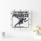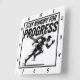 This white wall clock features the motivational text "STAY HUNGRY FOR PROGRESS" in a bold black font. Below the text is a dynamic black and white graphic of a runner, who appears to be a light-skinned individual, in full stride with speed lines indicating motion. The design encourages a mindset of continuous improvement and drive.