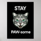 Stay Paw-some is a cat pun design with an illustration of a cat on black background. Created with www.kittl.com.