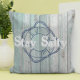 Beach themed throw pillow has blue tinted wood pattern that looks like it was rescued from a weathered beach cottage with navy life preserver ring line art graphic and overlay of customisable "Stay Salty" text in distressed white font.