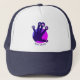 Stay weird hat with a funny digital illustration of a dark palm with fingers ending in eyeballs with pink irises and strange white eyelashes watching you over purple background.