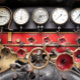 The steam train drivers view from the footplate of the gauges and controls of the train.