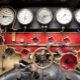 The steam train drivers view from the footplate of the gauges and controls of the train.