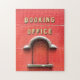 A photographic design of the front of an old railway station booking office, where you could purchase your travel tickets from.