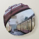 An art design of a steam train and red and yellow carriages waiting at the train station.