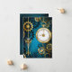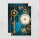 Turquoise, textured, steampunk background with brass and gold gears, a silver key and the clock. Steampunk style.