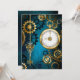 Turquoise, textured, steampunk background with brass and gold gears, a silver key and the clock. Steampunk style.