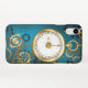Turquoise, textured, steampunk background with brass and gold gears, a silver key and the clock. Steampunk style.