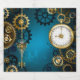 Turquoise, textured, steampunk background with brass and gold gears, a silver key and the clock. Steampunk style.