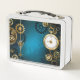 Turquoise, textured, steampunk background with brass and gold gears, a silver key and the clock. Steampunk style.