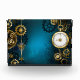 Turquoise, textured, steampunk background with brass and gold gears, a silver key and the clock. Steampunk style.