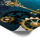 Turquoise, textured, steampunk background with brass and gold gears, a silver key and the clock. Steampunk style.