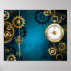 Turquoise, textured, steampunk background with brass and gold gears, a silver key and the clock. Steampunk style.
